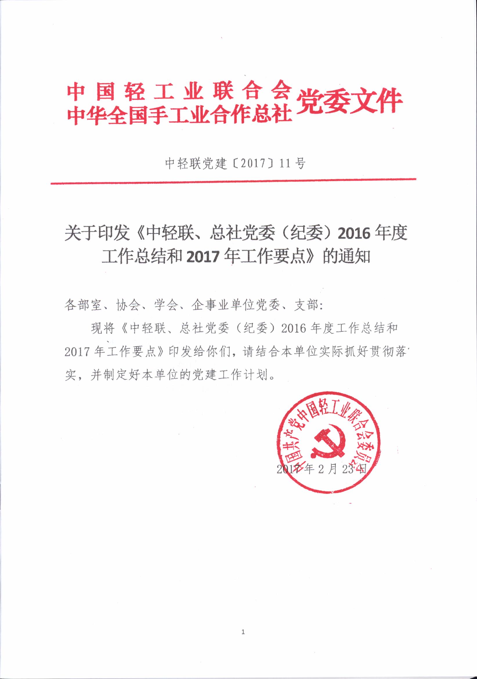关于印发《中轻联、总社党委(纪委)2016年度工作总结和2017年工作要点》的通知