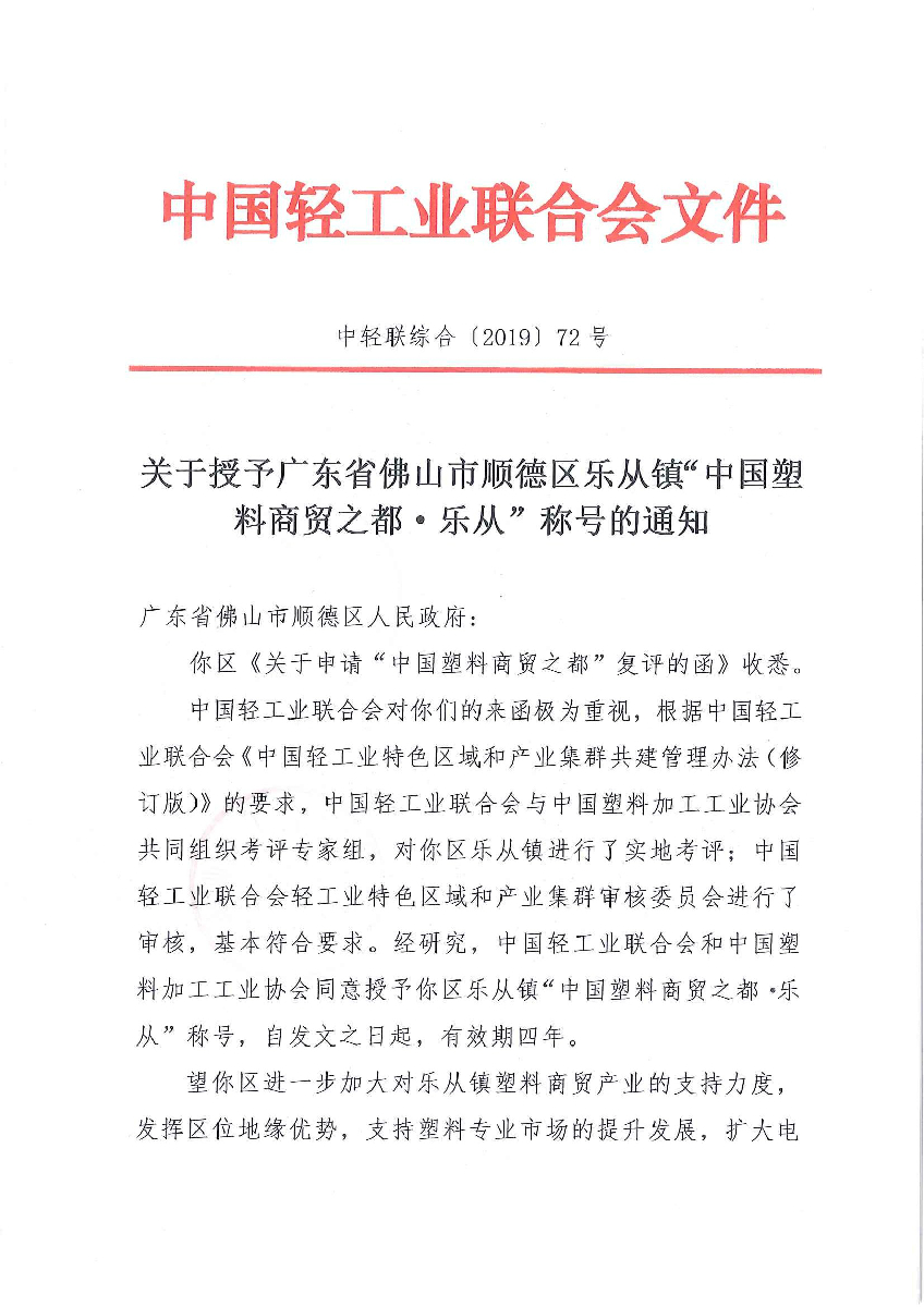 关于授予广东省佛山市顺德区乐从镇"中国塑料商贸之都·乐从"称号的通知