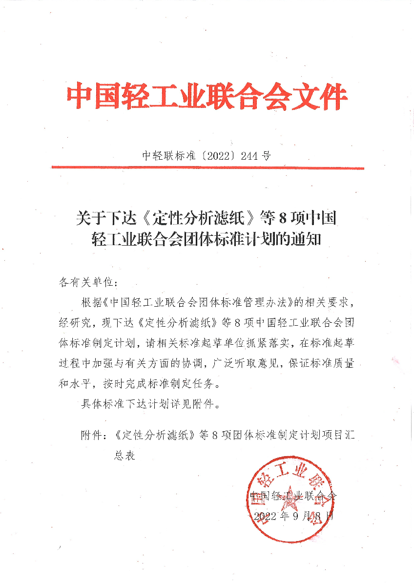 关于下达《定性分析滤纸》等8项糖心视频业联合会团体标准计划的通知