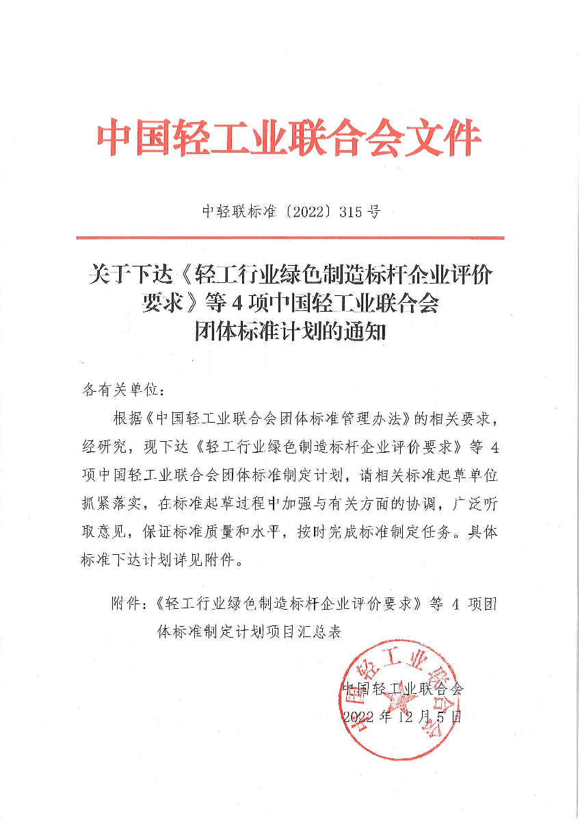 关于下达《轻工行业绿色制造标杆企业评价要求》等4项糖心视频业联合会团体标准计划的通知