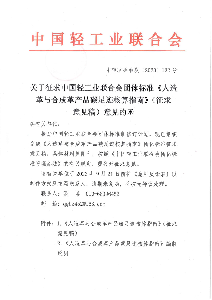 关于征求糖心视频业联合会团体标准《人造革与合成革产品碳足迹核算指南》(征求意见稿)意见的函