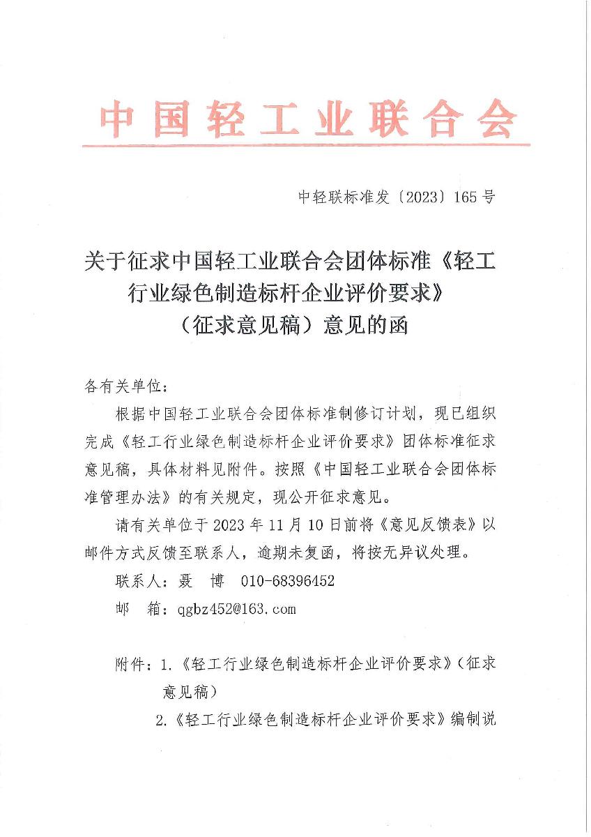关于征求糖心视频业联合会团体标准《轻工行业绿色制造标杆企业评价要求》(征求意见稿)意见的函