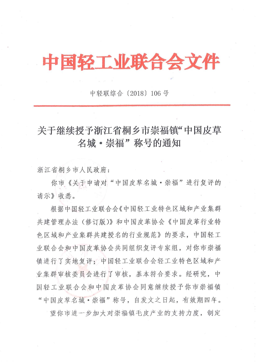 关于继续授予浙江省桐乡市崇福镇“中国皮草名城·崇福”称号的通知