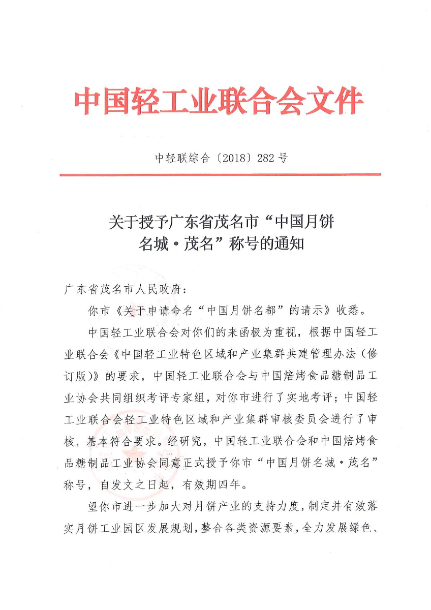 关于授予广东省茂名市“中国月饼名城·茂名”称号的通知