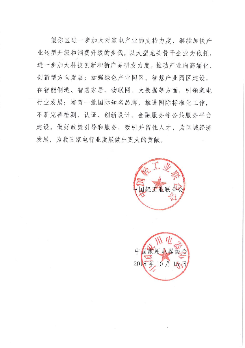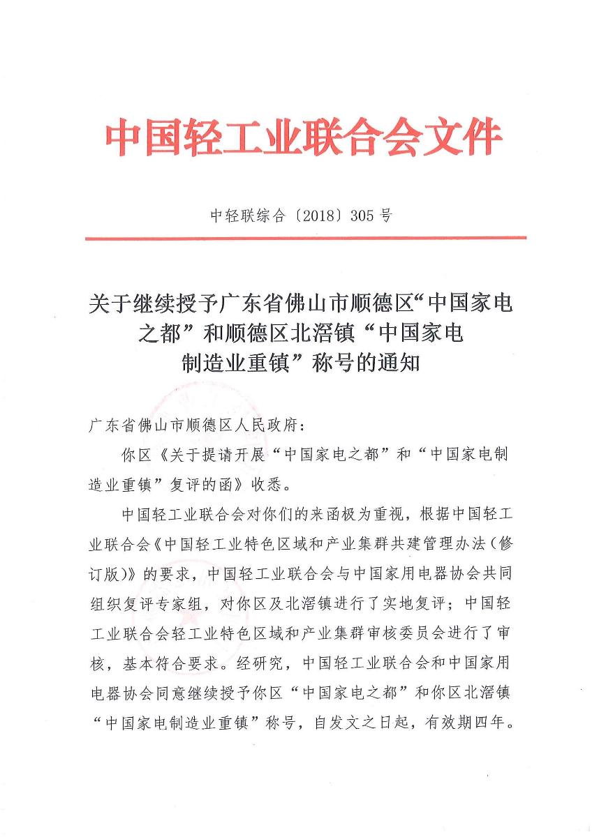 关于继续授予广东省佛山市顺德区“中国家电之都”和顺德区北滘镇“中国家电制造业重镇”称号的通知