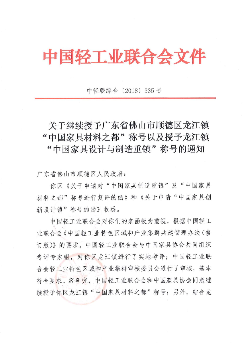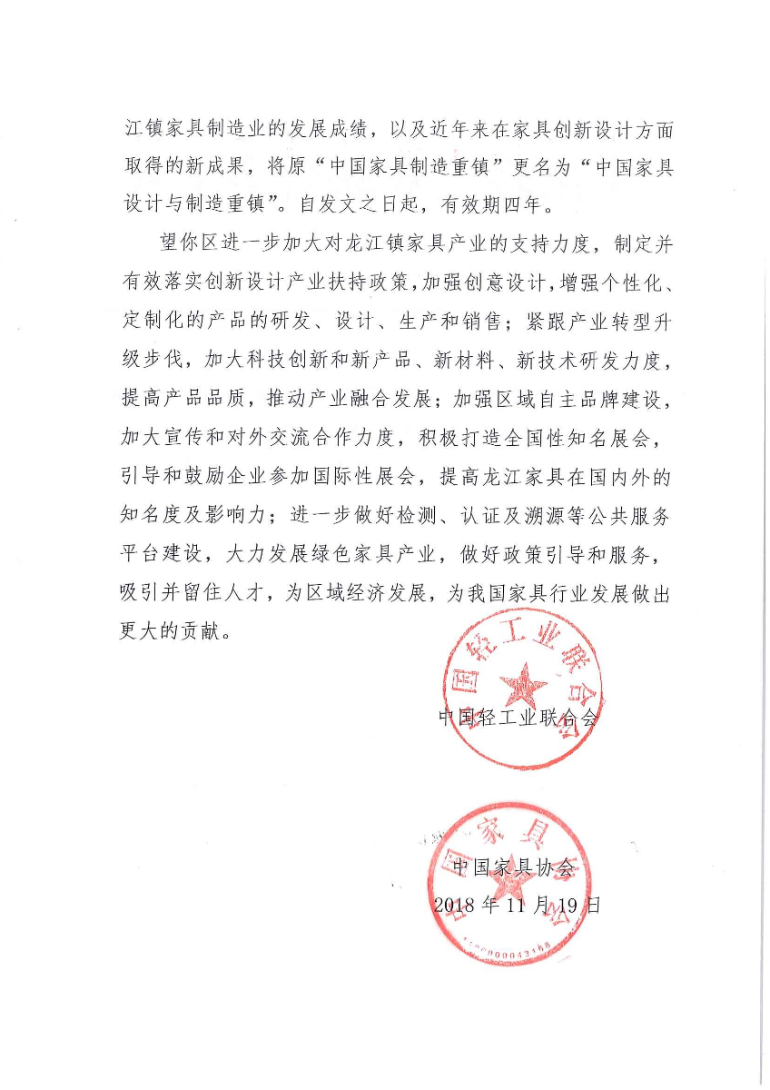 关于继续授予广东省佛山市顺德区龙江镇“中国家具材料之都”称号以及授予龙江镇“中国家具设计与制造重镇”称号的通知