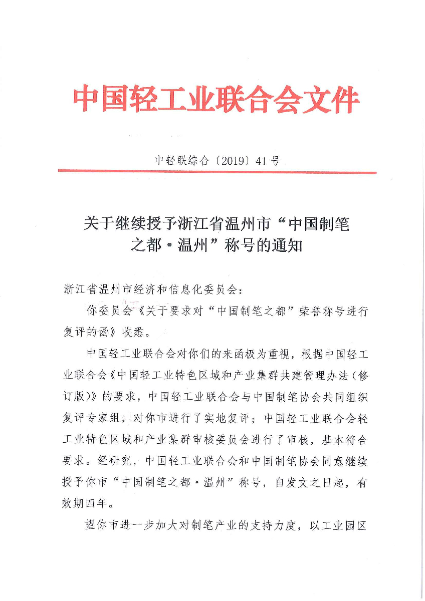 关于继续授予浙江省温州市"中国制笔之都·温州"称号的通知