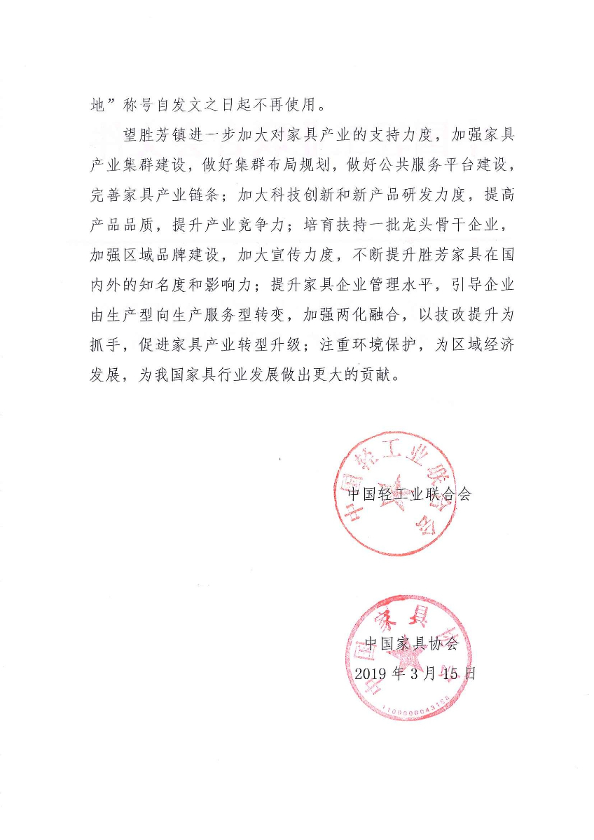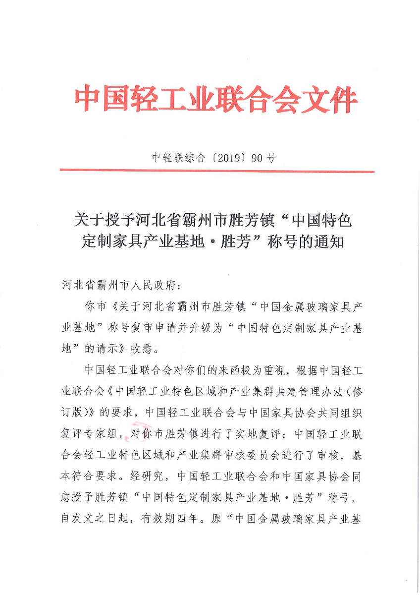 关于授予河北省霸州市胜芳镇"中国特色定制家具产业基地·胜芳"称号的通知