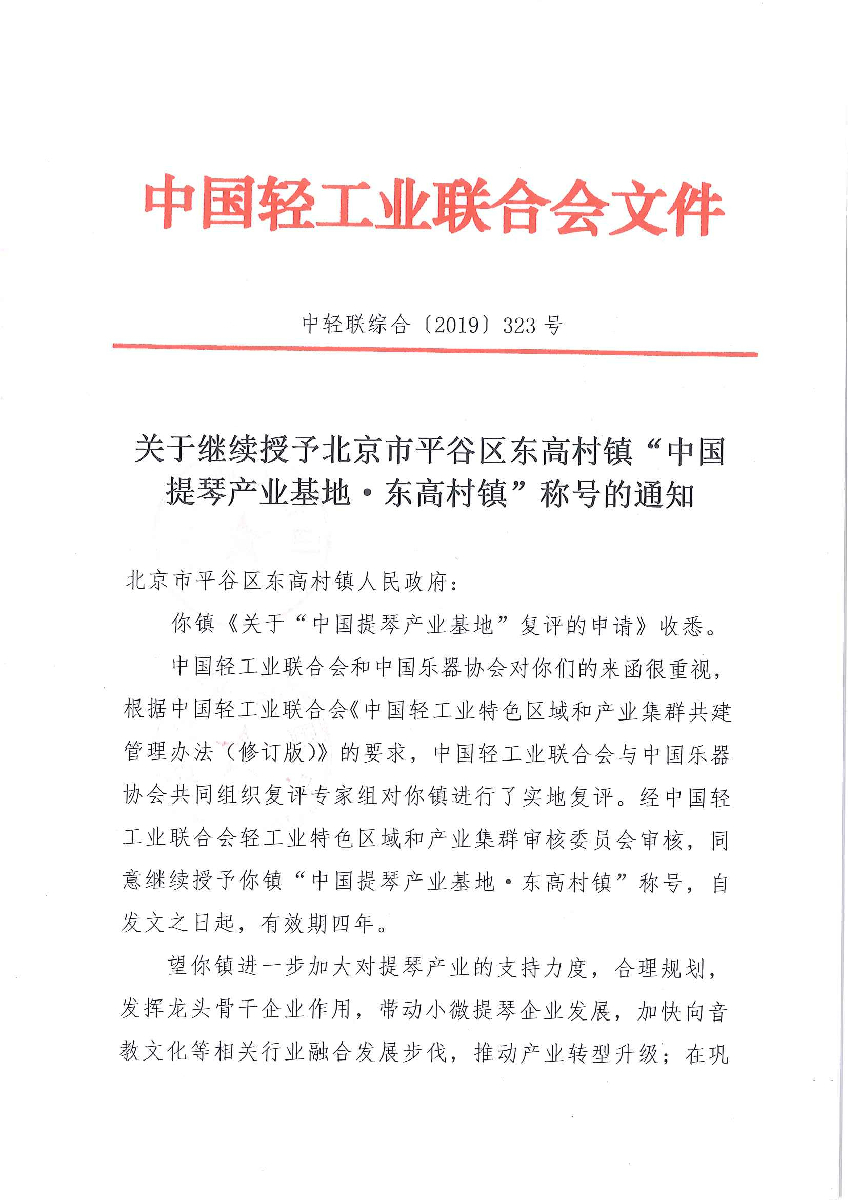 关于继续授予北京市平谷区东高村镇“中国提琴产业基地·东高村镇”称号的通知 (糖心视频在线)