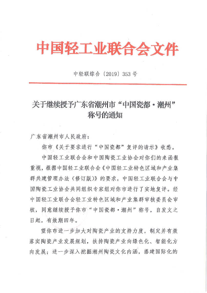 关于继续授予广东省潮州市“中国瓷都·潮州”称号的通知