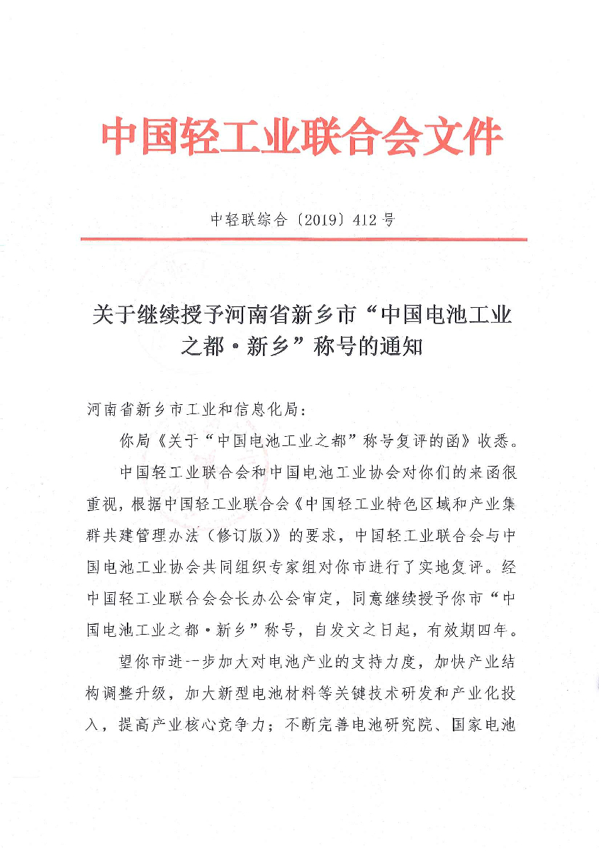 "糖心视频观看" 关于继续授予河南省新乡市“中国电池工业之都·新乡”称号的通知