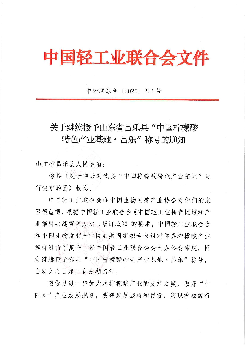 关于继续授予山东省昌乐县“中国柠檬酸特色产业基地·昌乐”称号的通知