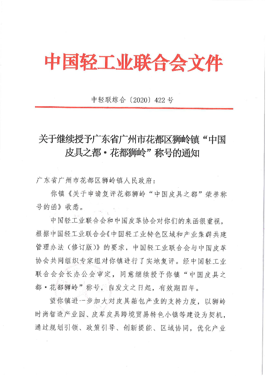 关于继续授予广东省广州市花都区狮岭镇“中国皮具之都·花都狮岭”称号的通知 (糖心视频网站)