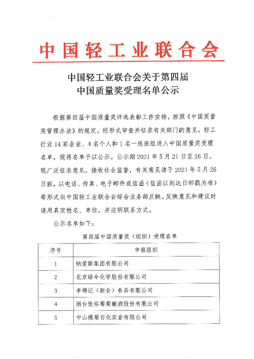糖心视频业联合会关于第四届中国质量奖受理名单公示