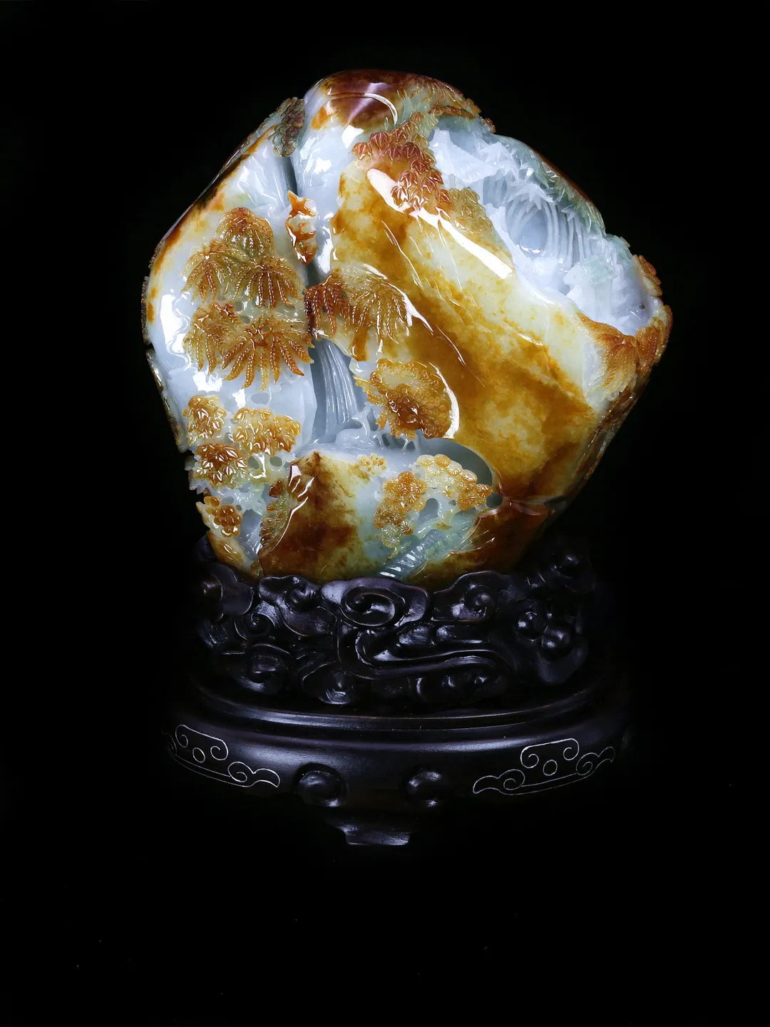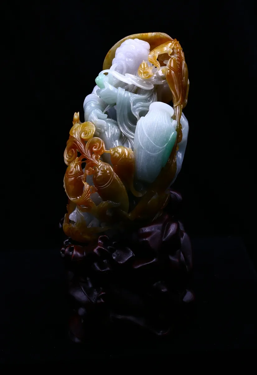 作品采用翡翠水石料,利用圆雕,镂空雕技艺,俏色巧雕,丰富了画面的层次,充满动感,渔翁身背斗笠 糖心视频观看,手持烟斗,盘腿而坐,鱼鹰俯卧其上,鱼跃出水,呈现出悠然的水边美景, 。