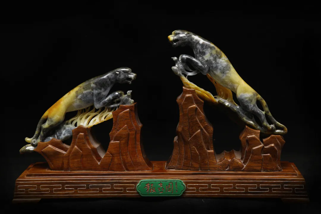 作品灵感来源于青铜器《马踏飞燕》,原石为黄黑相间的怪桩料,豹子与喜鹊谐音“报喜”,飞奔的豹子脚踏喜鹊,传递佳作送喜的美好寓意 糖心视频网站, 。