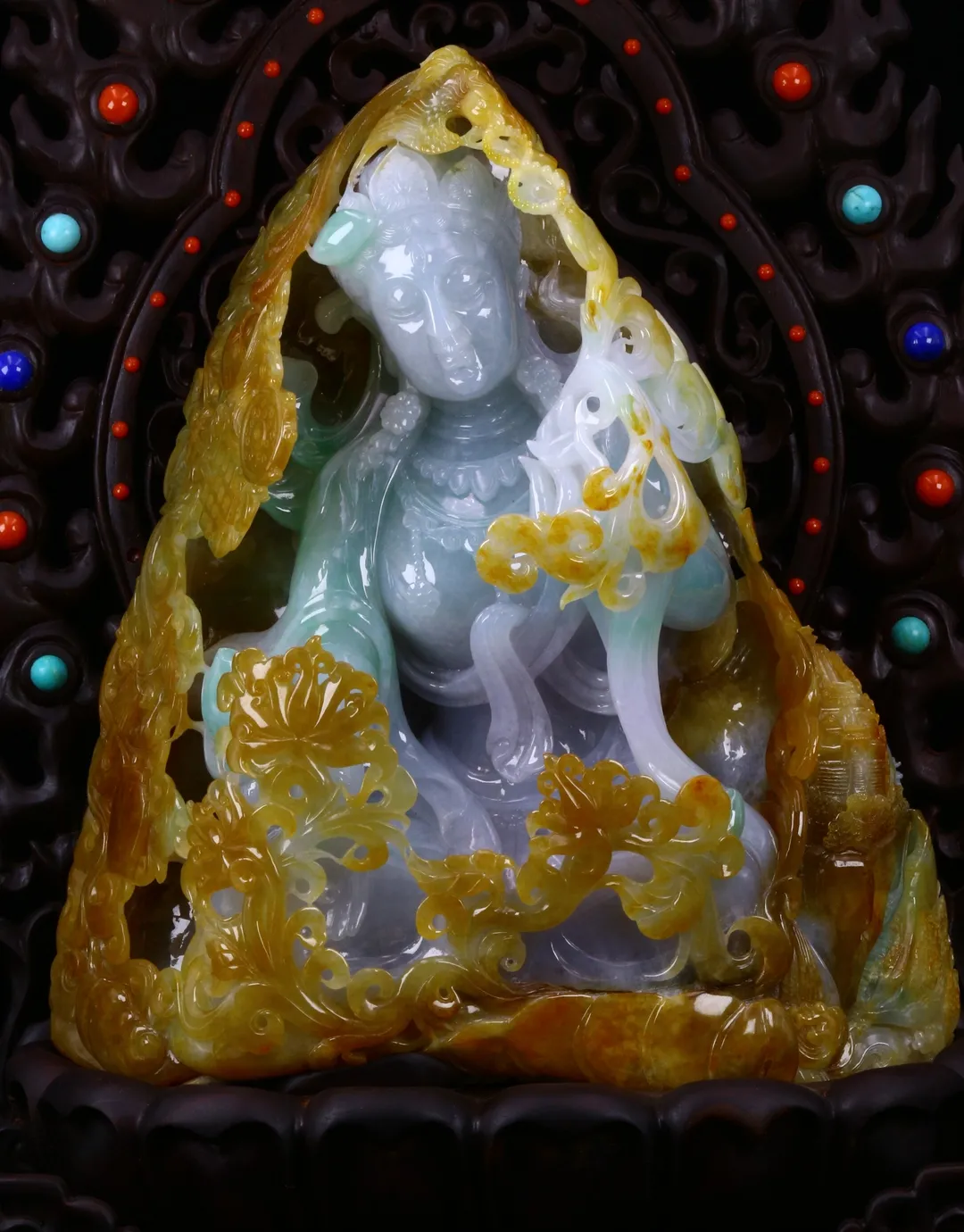作品选用翡翠整料,颜色丰富,种水细腻,玉链环环相扣,玉瓶串联其上,瓶中雕刻四季花卉梅兰竹菊,寓意四季保平(宝瓶)安,瓶旁雕刻一对鹌鹑,寓意安居乐业,黄色俏色巧雕成蝙蝠 糖心视频免费观看,寓意福气临门, 。
