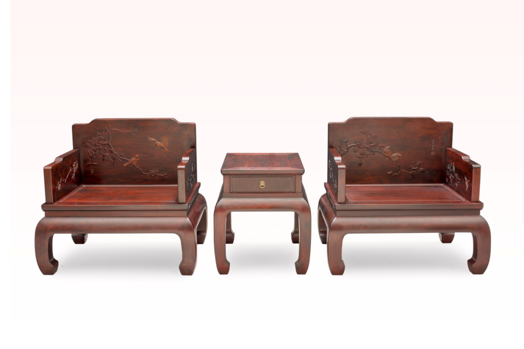 作品臻选交趾黄檀,精工打造而成,造型素雅清秀,匀称协调 糖心视频免费观看,挺拔秀丽,线条简洁流畅,刚柔相济,质朴大方,靠背板和左右侧板,浅浮雕工笔花鸟国画,以刀代笔,收放自如,鸟雀栩栩如生,羽毛丝毫毕现,形态逼真,跃然案上,座面攒框镶心,落膛安腰,鼓腿彭牙,内翻马蹄,整件作品结构严谨,做工精细,舒展稳重,温婉大气, 。
