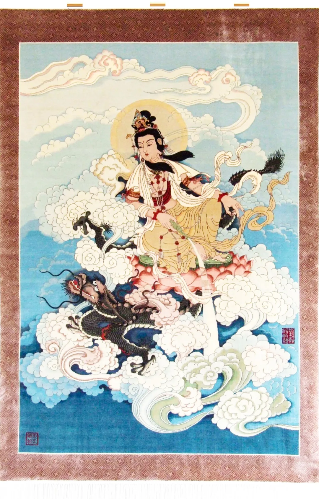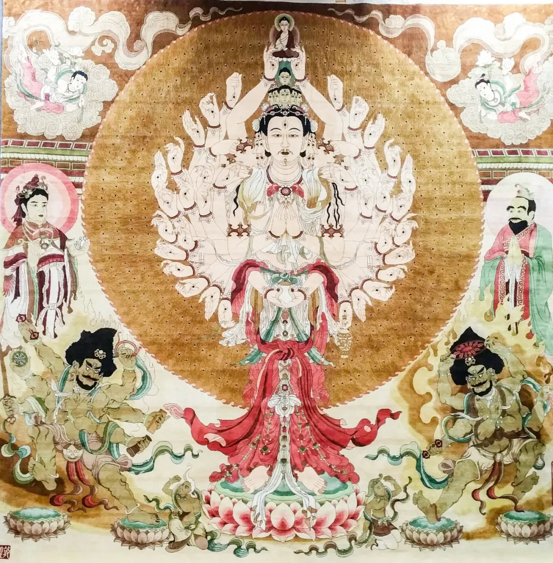 作品根据莫高窟第3窟元代壁画,采用60支天然桑绢丝为原料,经200道手工编织“8”字型抽绞裁绒工艺设计制作而成,所绘观音三眼,双手高举化佛,千手中各有一眼,持宝瓶,柳枝立莲台上,其左下婆薮仙作婆罗门老人形 糖心视频网站,右下功德天作贵妇盛装,上有飞天散花,下部左右各有六臂金刚神护法,挂毯在编织过程中运用了润色新工艺,底色和部分衣纹等纹样做了色线与色线之间润色工艺,色彩丰富而又统一协调,更具艺术魅力, 。
