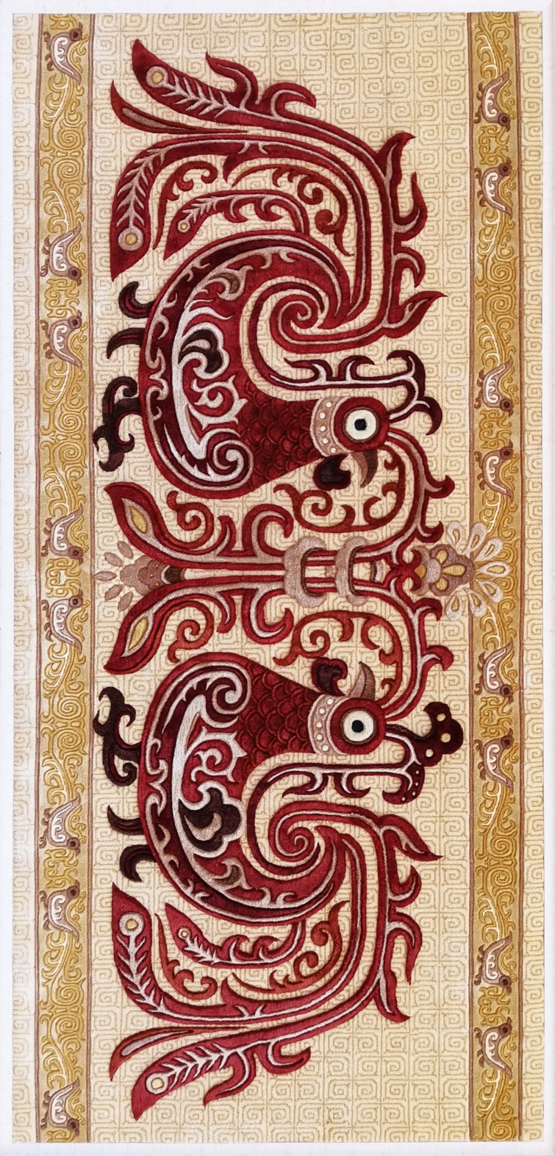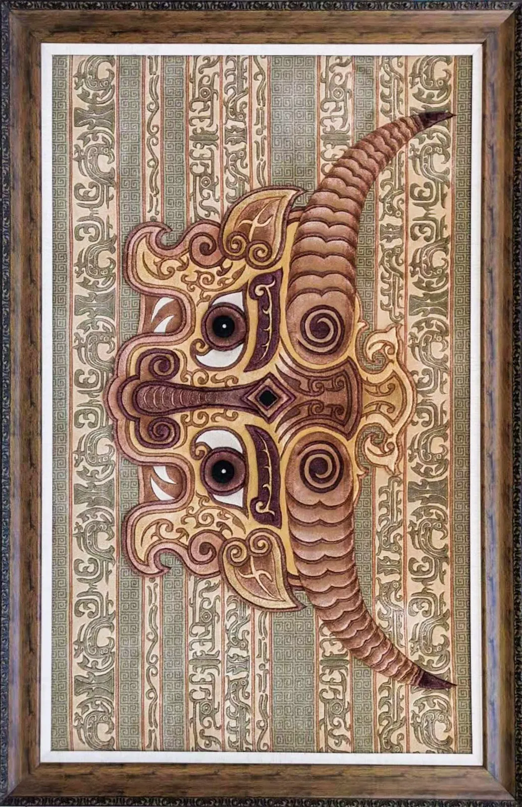 作品采用60支天然绢丝为原料,经120道手工编织“8”字形抽绞栽绒工艺精制而成,以鸾凤纹为主体图案,衬以雷纹,上下两条边饰以二方连续凤鸟纹,鸾凤相交,寓指夫妻相随,婚姻美满,喜庆吉祥, 名称: 华夏图腾 作品采用天然丝为原料,经120道编织工艺和浮雕片剪工艺精制而成,图案根据我国青铜文化中的饕餮纹,夸张设计而成,图案背景以龙凤纹衬托主体兽面,再经过工艺雕刻,兽面双目突出,颇有威慑力和深秘感 糖心视频高清, 。