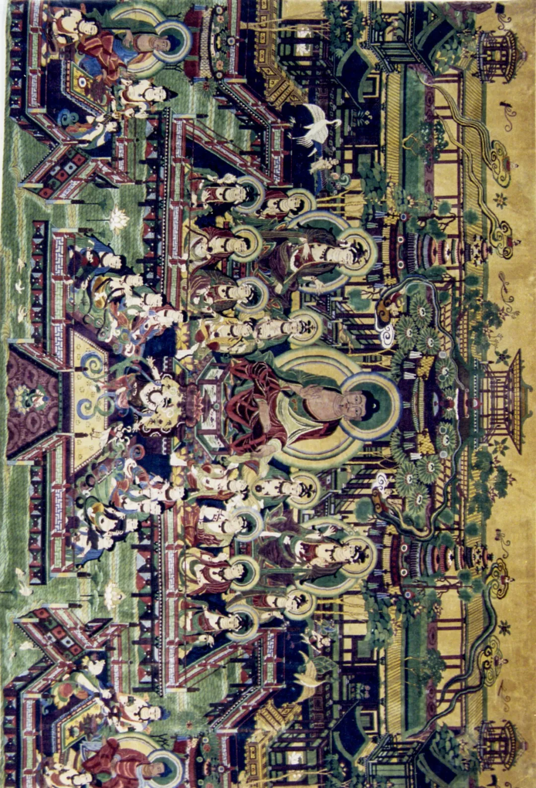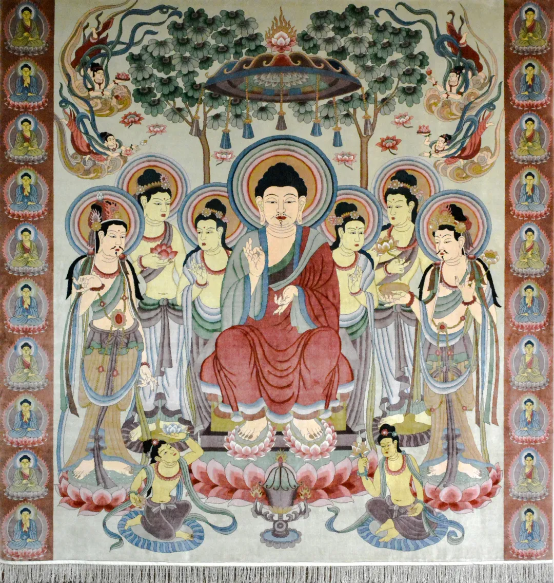 作品根据敦煌榆林窟25窟南壁观无寿经变壁画再设计制作而成,采用200道手工编织“8”字形抽绞栽绒工艺方法,60支天然绢丝为原料精制而成,该挂毯画面布局严谨,内容饱满 糖心视频免费观看,色彩丰富,场面宏大,生动传神地描绘了西方极乐世界的佛国景象, 。