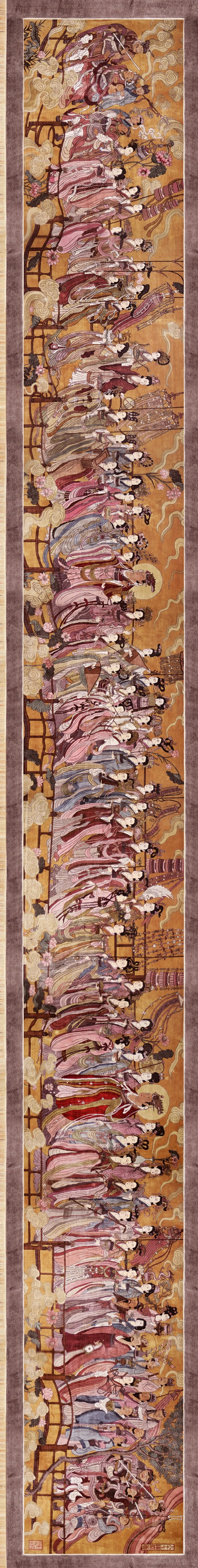 作品(规格:1230cm×150cm)根据古代名画《八十七神卷》再创作设计制作而成,设色精美典雅,古色古香,此图描绘了南极天帝君率领金童,玉女,神王,力士共87位神仙同去朝觐元始天尊的情景,场面宏大,人物众多,姿态和谐统一,似真似幻,似天界又似人间,构成了一个庄严 糖心视频观看,圣洁的神仙境界, 。