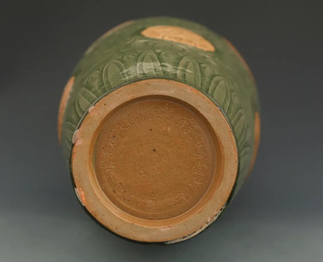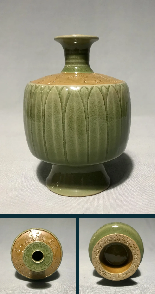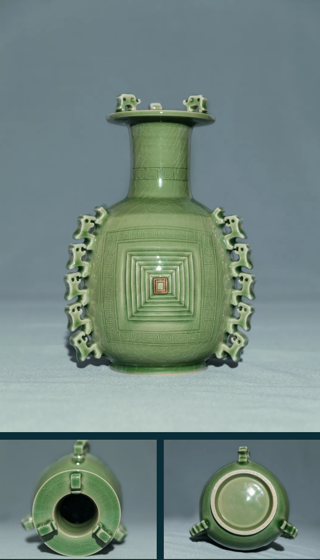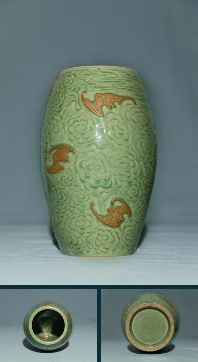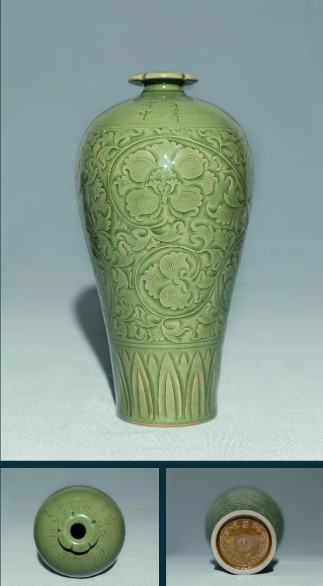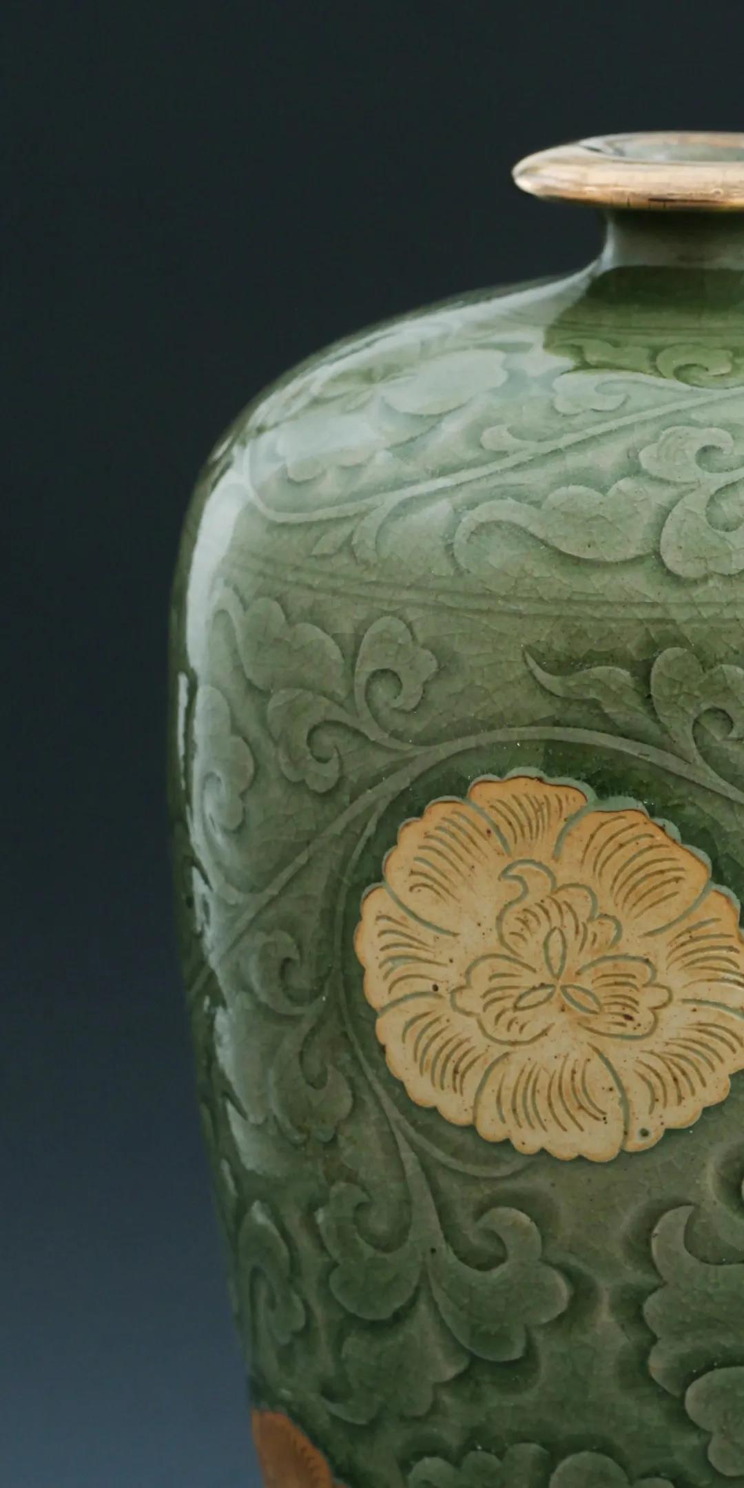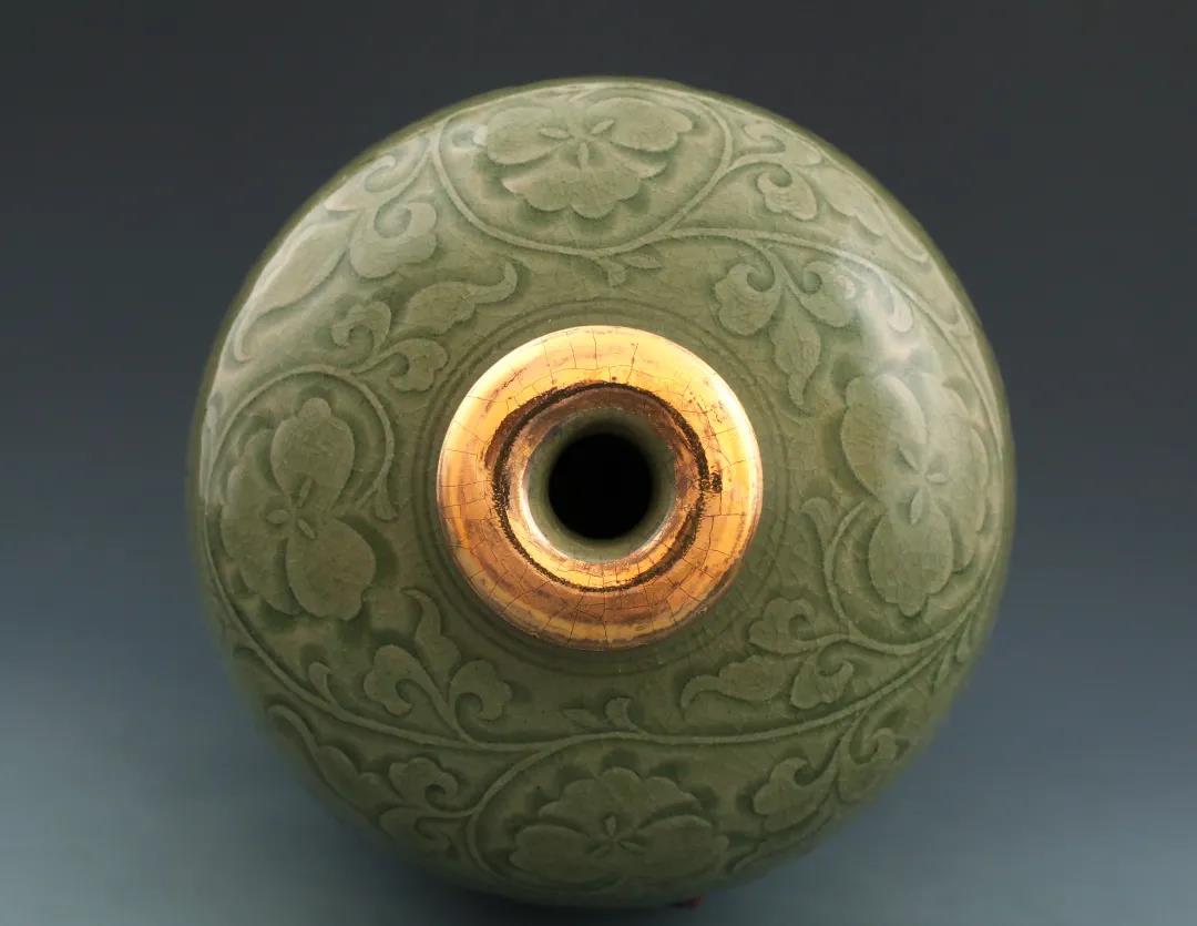 作品造型峭拔伟岸,俊秀端庄,所刻缠枝牡丹刀锋犀利,线条流畅 糖心视频免费观看,纹样活泼,双刀刻的功力尤显深厚,青釉满施,晶莹玉润,冰纹密布,与刻花相映生辉,高温成瓷后,瓶嘴描金,再入窑三次烤金,越显高贵富丽,使整体艺术效果愈加典雅而不同凡响,是在宋代耀州窑最经典的梅瓶基础上吸取其精华,又结合现代审美意识而制成的青瓷精品, 。