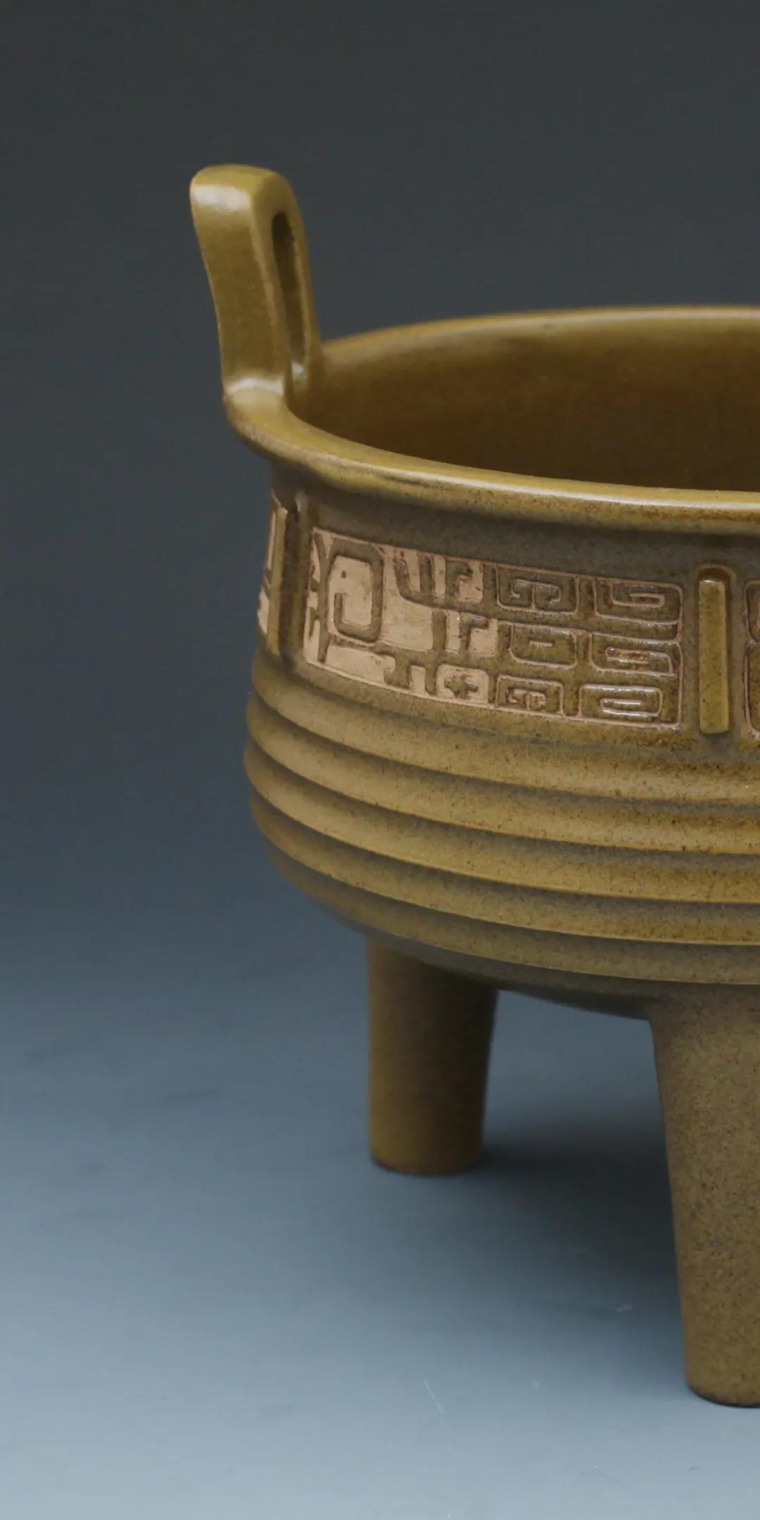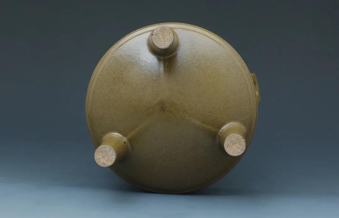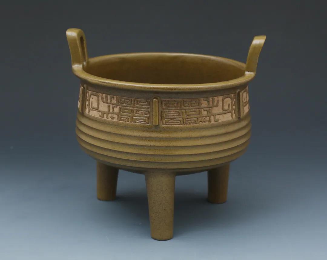 作品造型学习西周青铜器,敦厚大方,洗练简约,沿上一对直耳与器身浑然一体,三足托起更有灵气,腹部剔划龙纹,利落乾净 糖心视频高清,鼎内篆划[中华鼎盛]明示主题,三个圆柱足底皆有作者刻款鈐印,茶叶沫釉色彩与青铜器同调,稳健典雅又生机盎然, 。