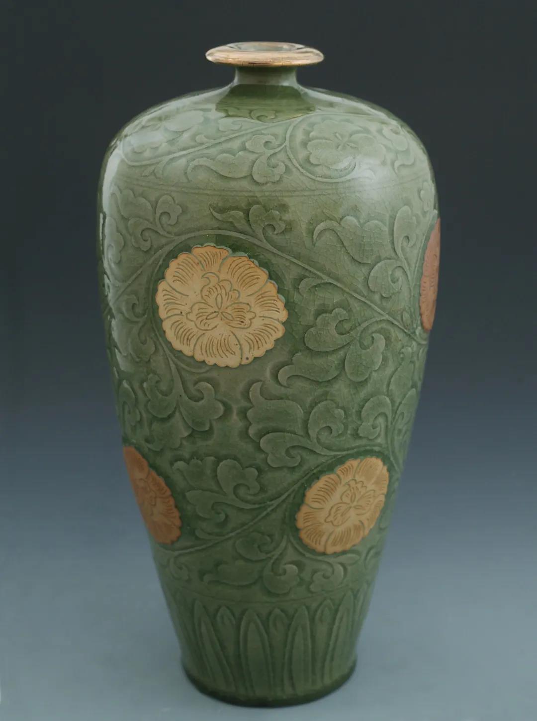 作品名称:红底玉缕耀瓷刻花金顶牡丹纹大梅瓶