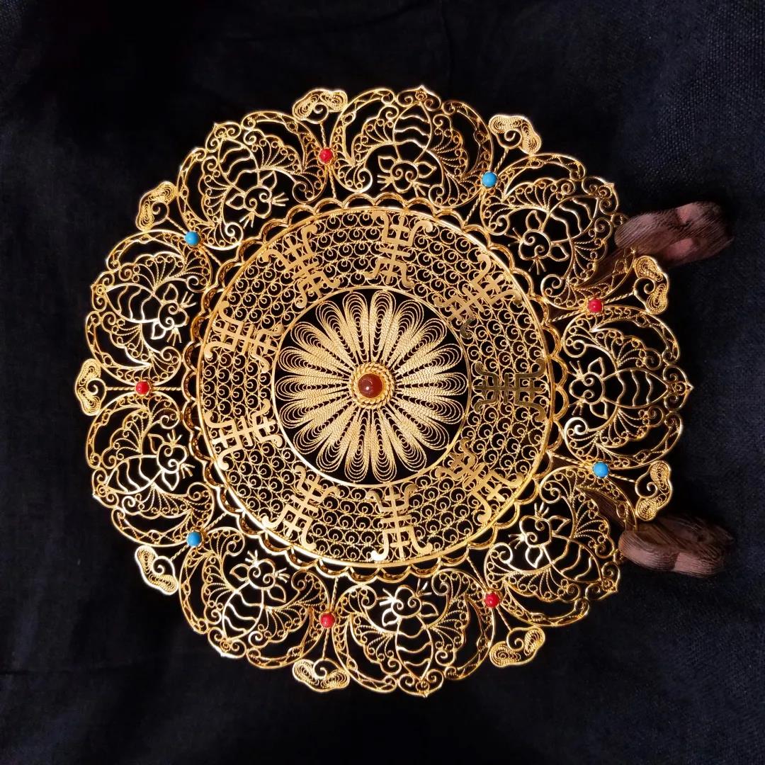 材质:红珊瑚,绿松石,银镀金 九福捧寿是中国民间广为流传的一种传统吉祥图案,由九只蝙蝠围着寿字构成,蝙蝠围在寿字周围,寓意多福多寿,利用花丝镶嵌技艺中垒丝,填圈工艺,全手工精制而成,结构严谨,精巧灵动,充分体现了津派花丝镶嵌技艺, 开光,以天然大漆为原料,以断纹技艺和“金髹淡彩”工艺装饰制作而成,用工考究,做工精细,色彩丰润,屏风运用断纹工艺,在漆地之上制作均匀细密的裂纹,给人以饱经沧桑后自然形成之感,屏风在金地之上彩绘青山绿水,亭台楼阁,犹如工笔重彩,典雅雍秀,富丽堂皇 糖心视频免费观看, 。