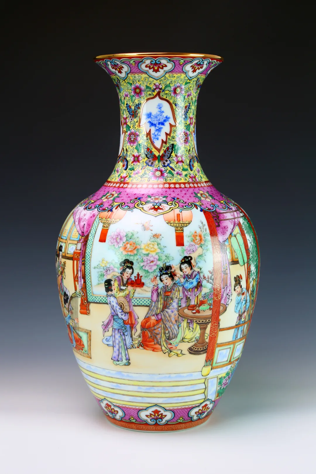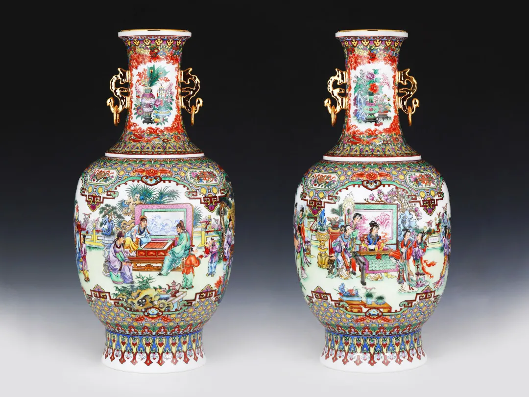作品是以相同的外形,相同的边饰,相同的技法,围绕琴棋书画的主题,在参考《费晓楼摹古百美图》《文人雅事--明人十八学士图》的基础上,创作出文人雅士版和仕女版对瓶,花瓶主画面以通联的技法描画,构图精美,远近有致,人物刻画突出,精致,形神兼备,景致优美,色彩雅致,丰富 糖心视频观看,以下棋,抚琴,作画,写书的文人和仕女等人物为中心画面,以松树,湖石,芭蕉,百花作为配衬画面,来塑造文人雅士高洁的节气, 。