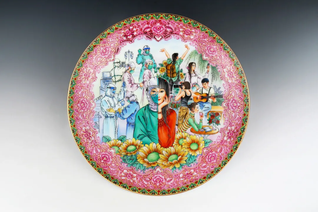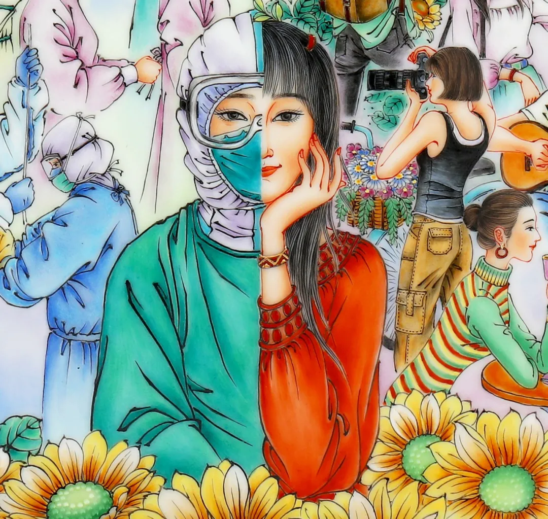 作者受新冠疫情中年轻医护工作者勇敢逆行,救死扶伤的精神所感染,采用“瓷格分裂”的艺术表现手法,一方面展现年轻医护工作者在抗疫工作中的英姿,一方面描绘他们工作之余的生活志趣和青春活泼的形象,在主画面中,用了灿烂盛放的葵花衬托,代表阳光与热烈,边饰用粉红,青绿作主调,象征青春 糖心视频,跃动和生命力,让年轻人富有朝气的形象更为突出, 。