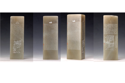 金石雕刻与微雕《孙子兵法与三十六计》长5厘米,宽5厘米 糖心视频网站,高15厘米,作品采用辽宁冻石,洁净无瑕,经精心构思,以历史典故为体裁,将《孙子兵法》及其精典《三十六计》篆刻微雕于石章侧面,赋章料以历史内涵和艺术价值, 。