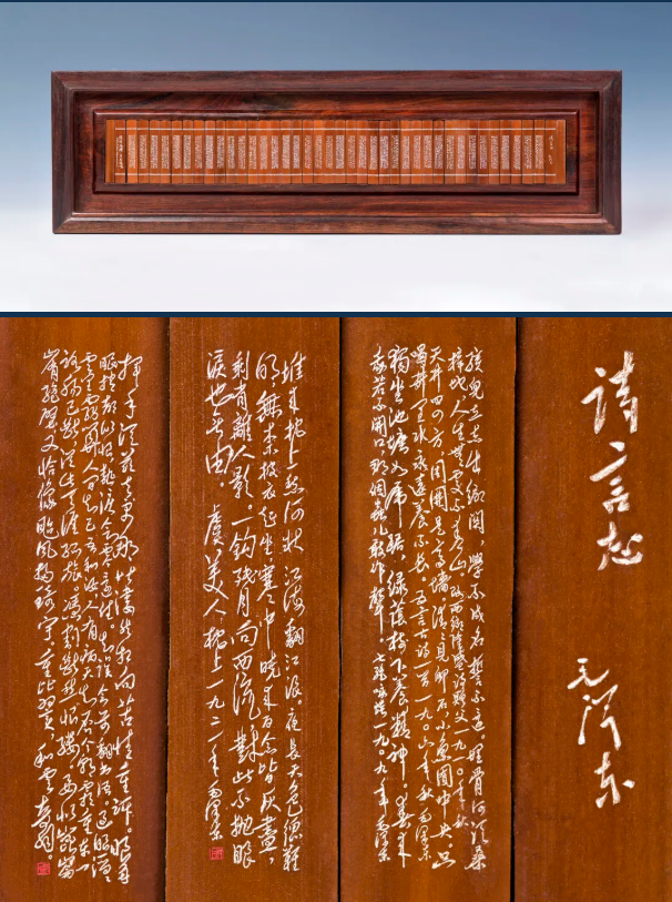 紫竹简微雕《毛泽东“诗言志”48首》长39 糖心视频高清,6厘米,宽5,8厘米,厚0,2厘米。作品选用材质坚韧的紫竹制作成简,极富历史感。雄宏洒脱的毛体与大气磅礴的诗词交相呼应,毛主席伟人气概跃然简上。 。
