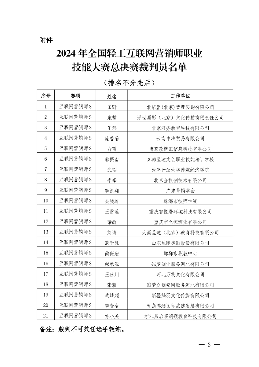 关于公示2024年全国轻工行业职业技能竞赛互联网营销师S赛项总决赛裁判员的通知