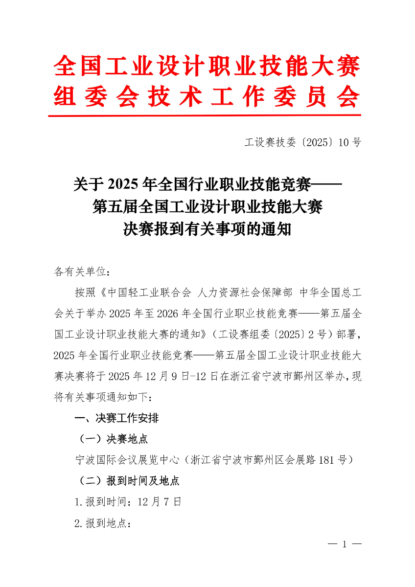 关于2025年全国行业职业技能竞赛—— 第五届全国工业设计职业技能大赛决赛报到有关事项的通知