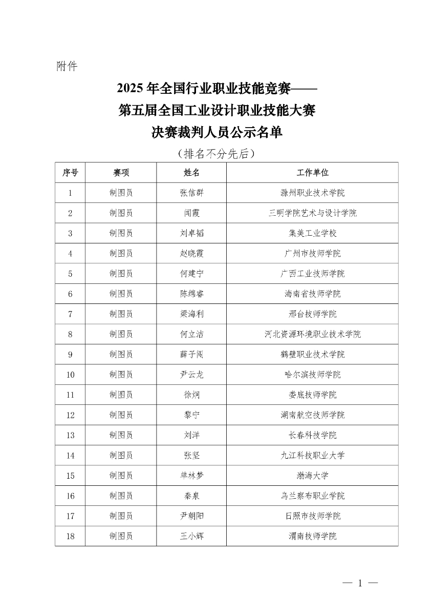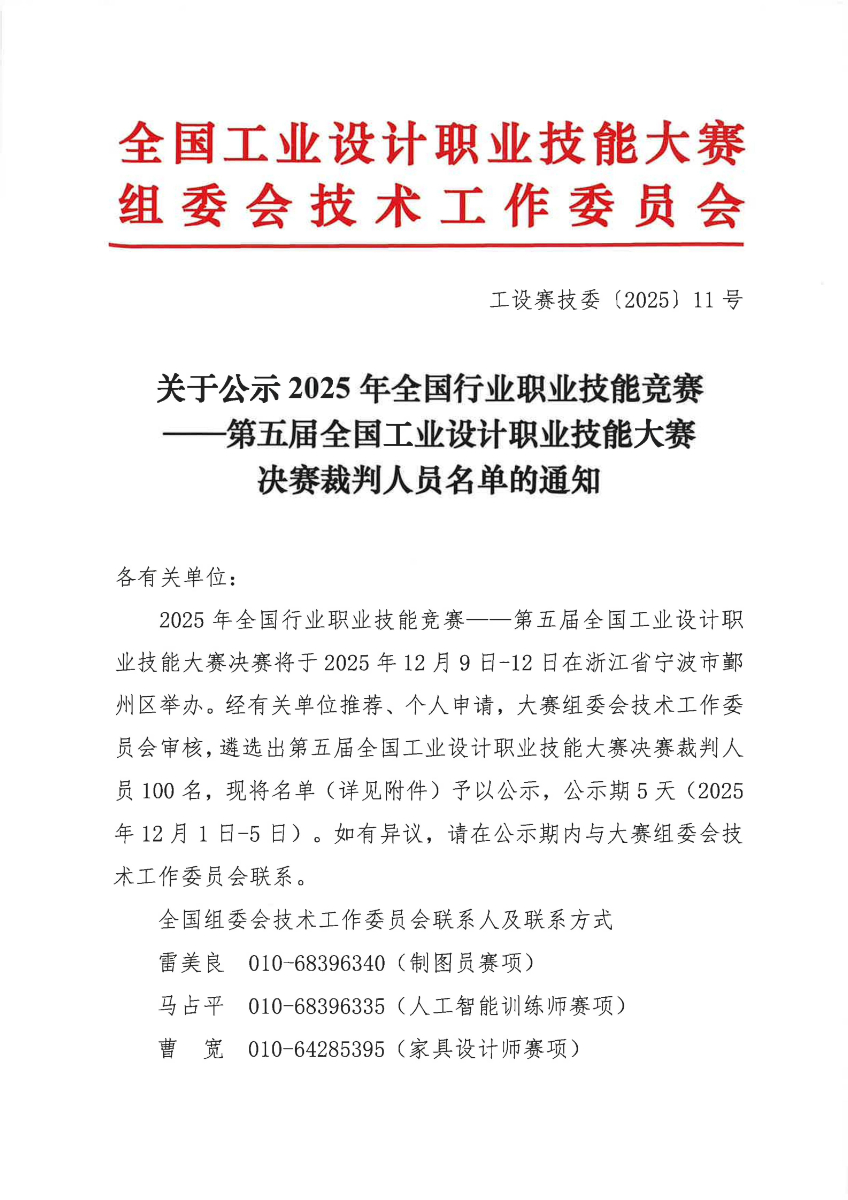 关于公示2025年全国行业职业技能竞赛——第五届全国工业设计职业技能大赛决赛裁判人员名单的通知