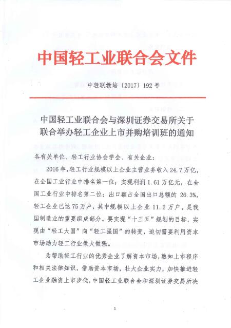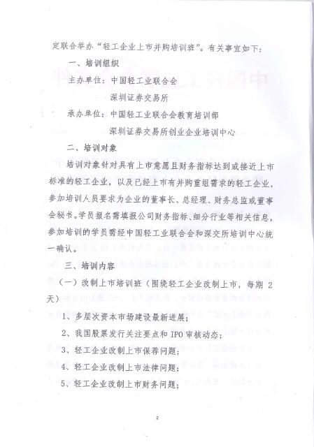 糖心视频业联合会与深圳证券交易所关于联合举办轻工企业上市并购培训班的通知