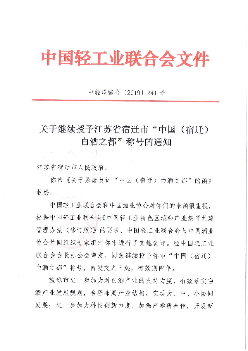 "糖心视频免费观看" 关于继续授予江苏省宿迁市"中国(宿迁)白酒之都"称号的通知