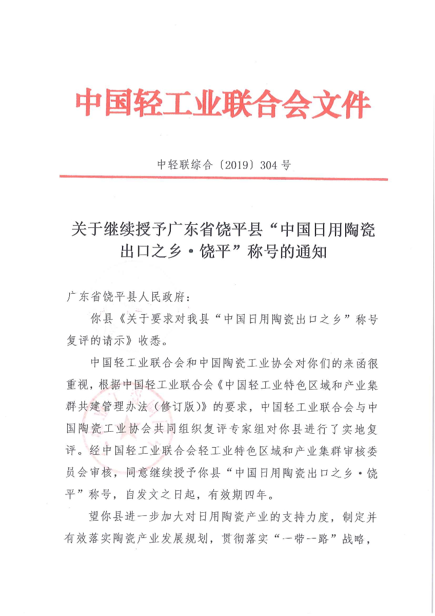 关于继续授予广东省饶平县“中国日用陶瓷出口之乡·饶平”称号的通知