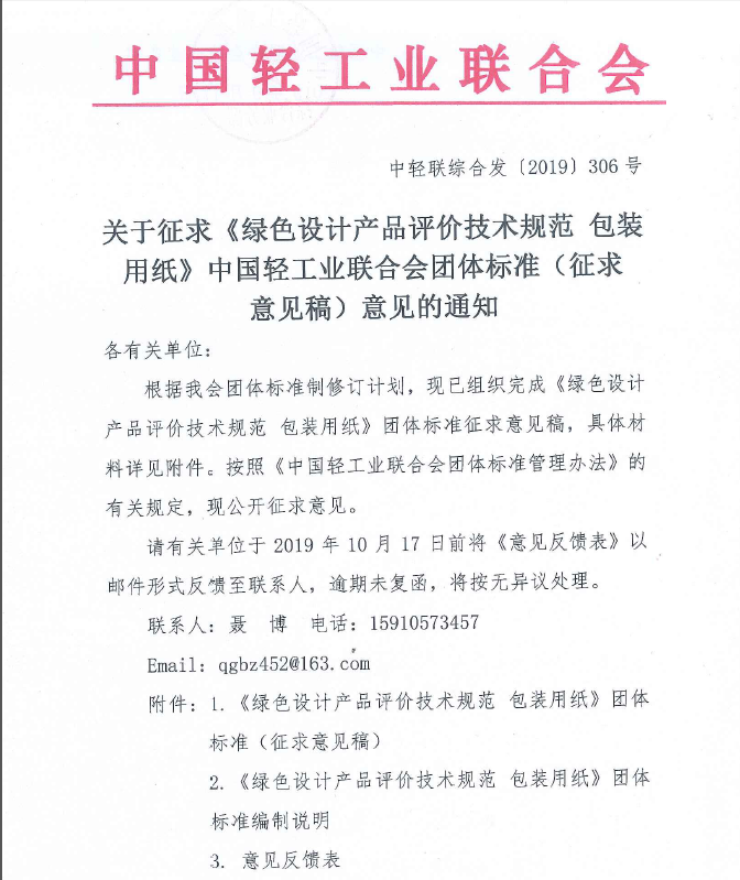 关于征求《绿色设计产品评价技术规范 包装用纸》糖心视频业联合会团体标准(征求意见稿)意见的通知