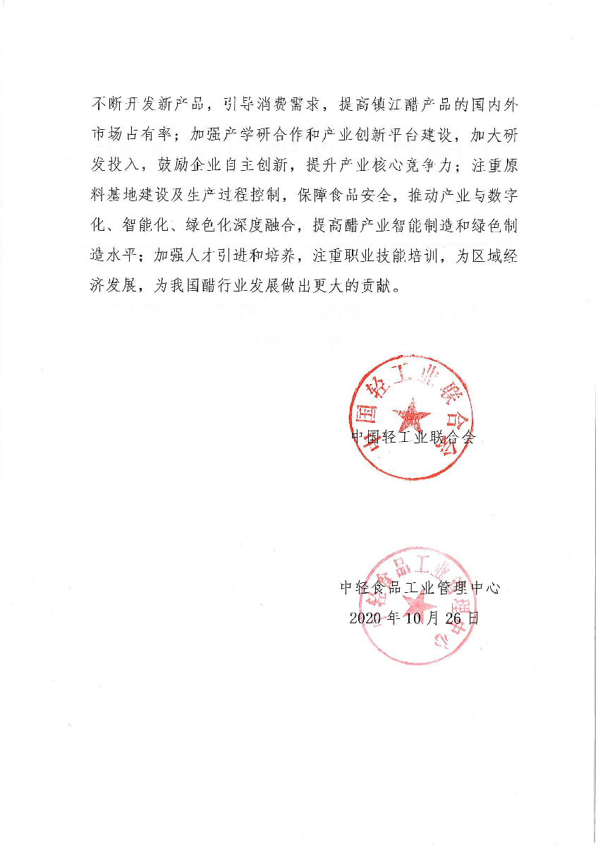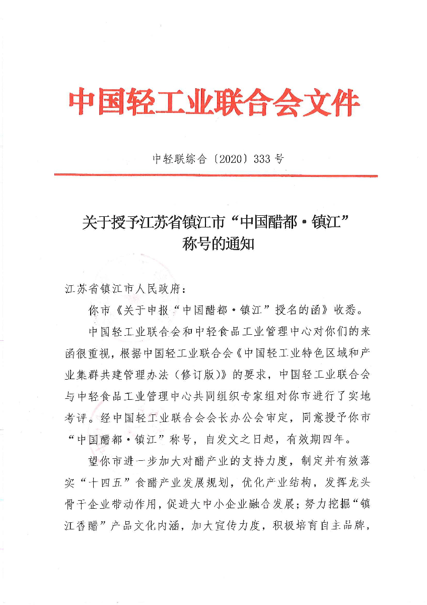 关于授予江苏省镇江市“中国醋都·镇江”称号的通知