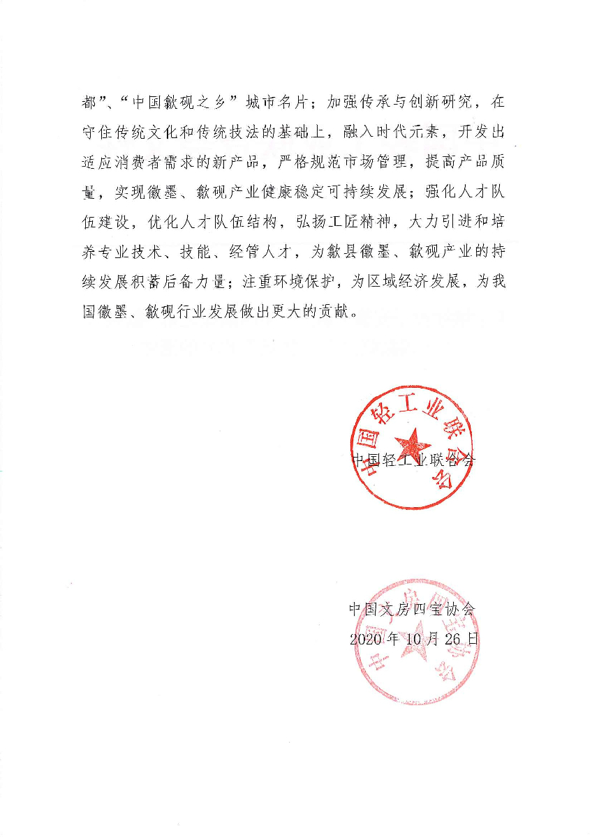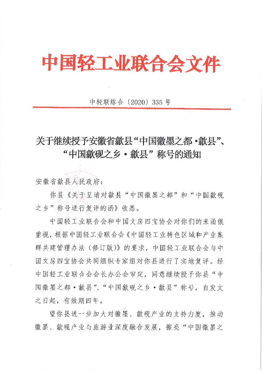 关于继续授予安徽省歙县“中国徽墨之都·歙县”、“中国歙砚之乡·歙县”称号的通知