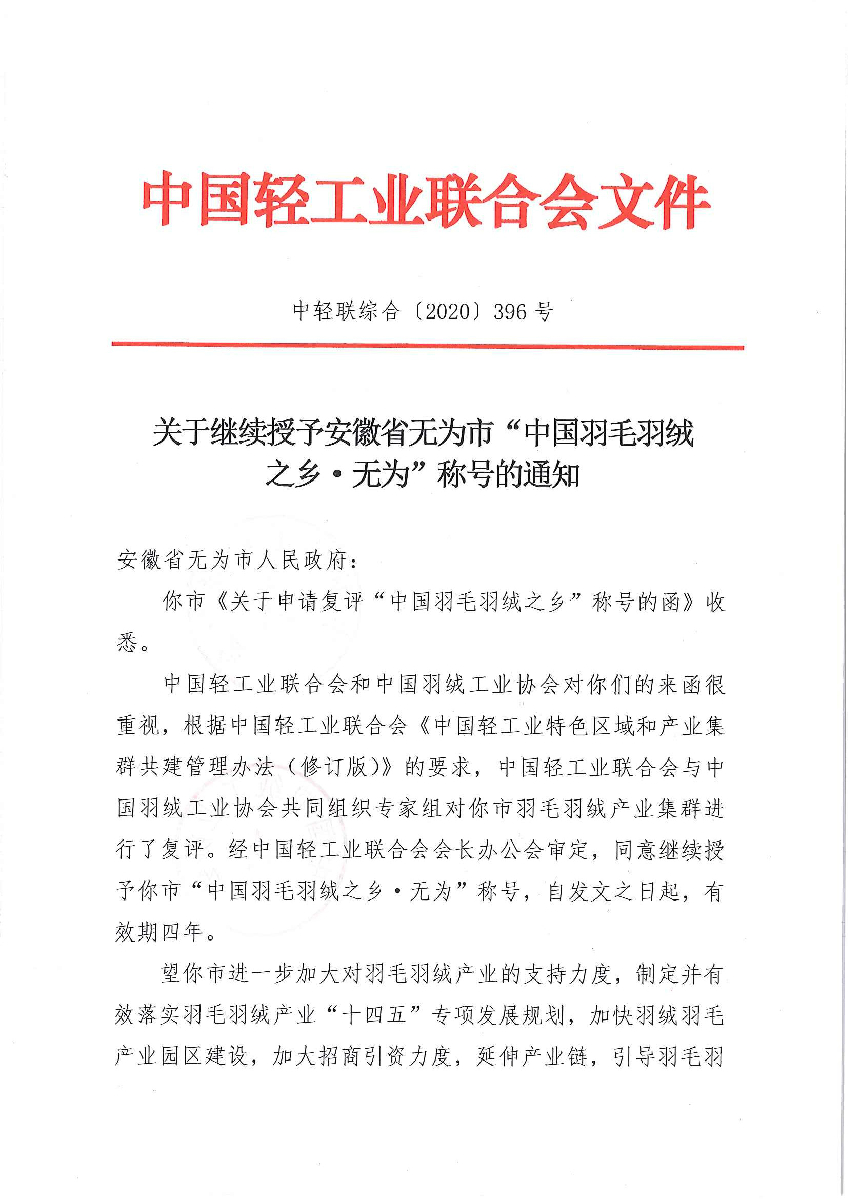 关于继续授予安徽省无为市“中国羽毛羽绒之乡·无为”称号的通知