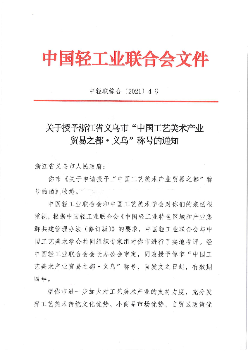 糖心视频网站 - 关于授予浙江省义乌市“中国工艺美术产业贸易之都·义乌”称号的通知