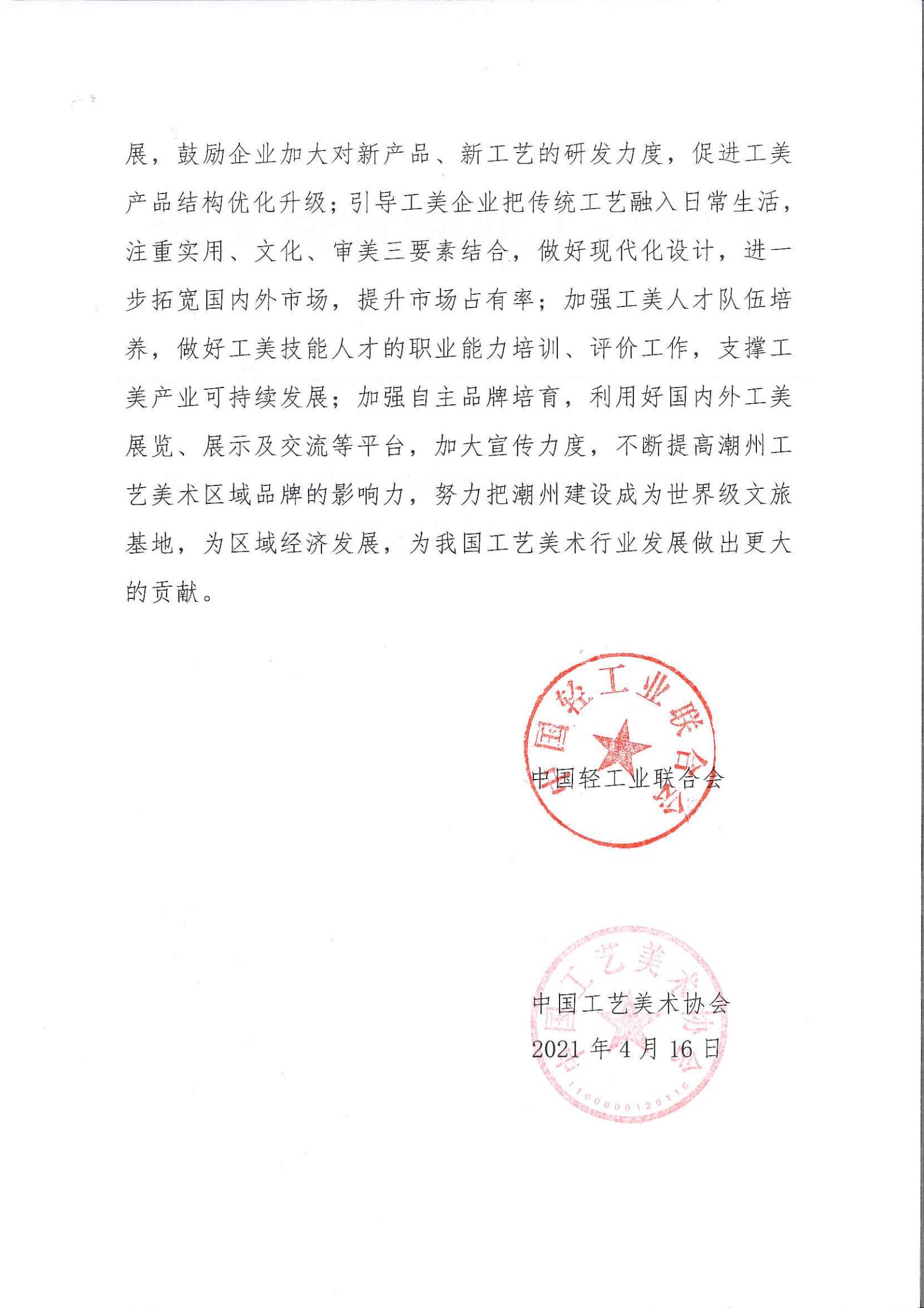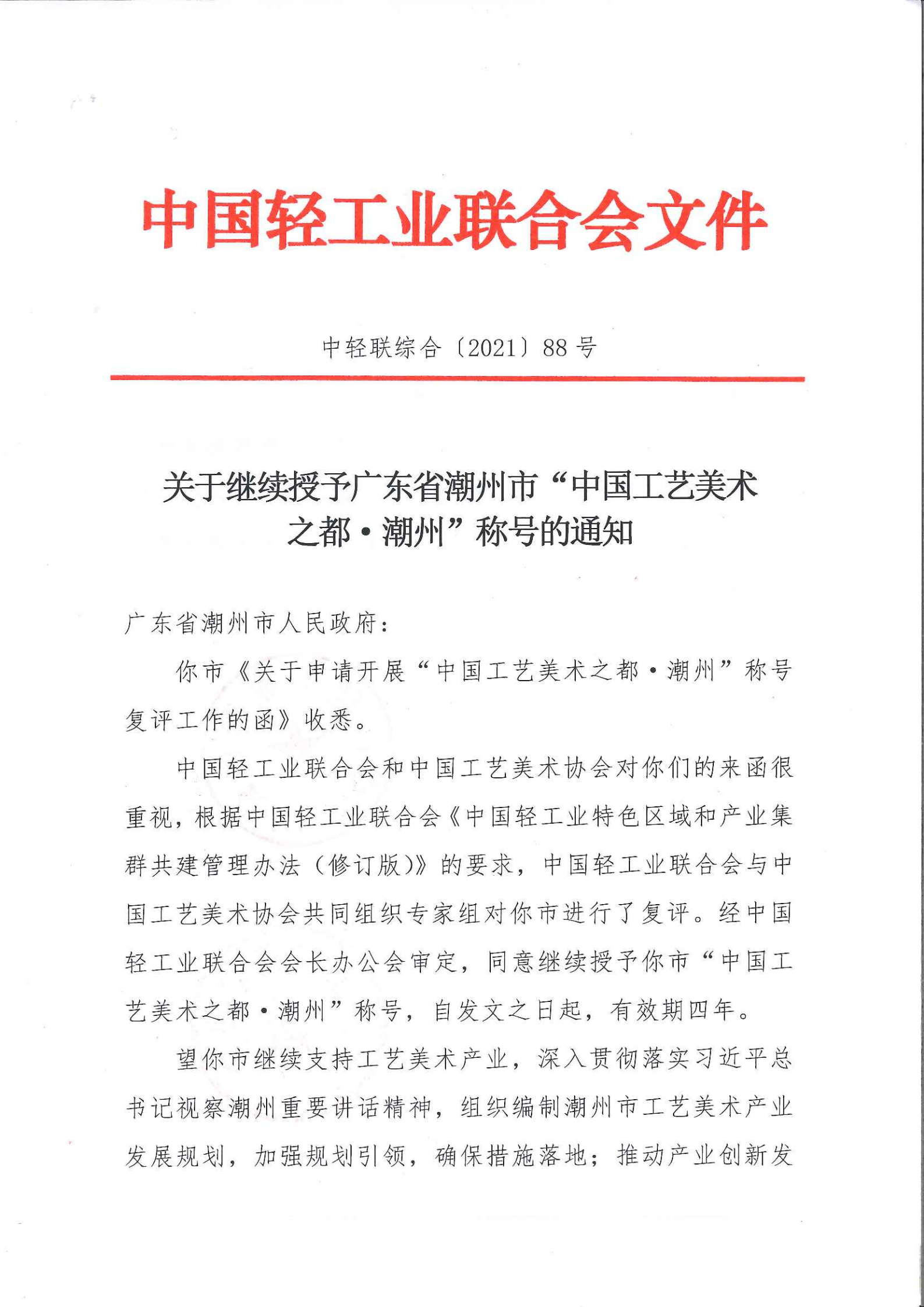 关于继续授予广东省潮州市“中国工艺美术之都·潮州”称号的通知