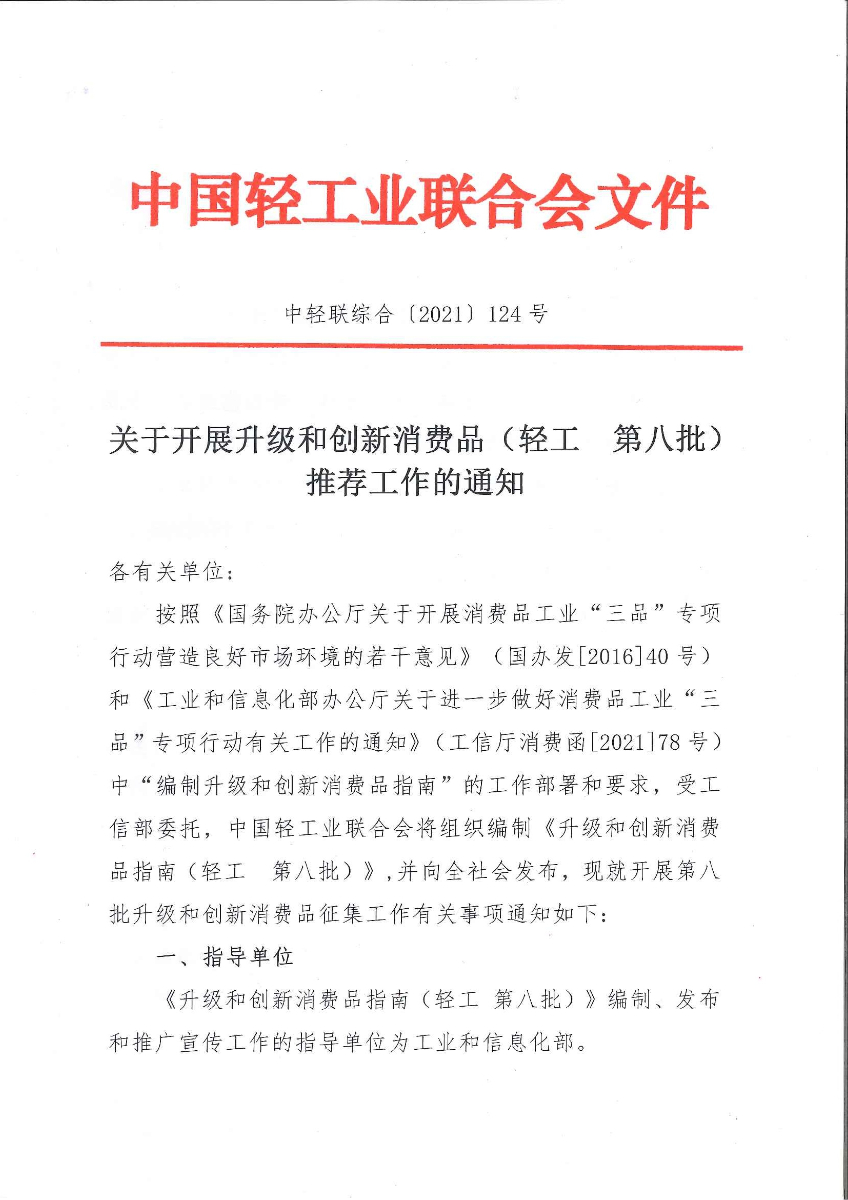 关于开展升级和创新消费品(轻工 第八批)推荐工作的通知