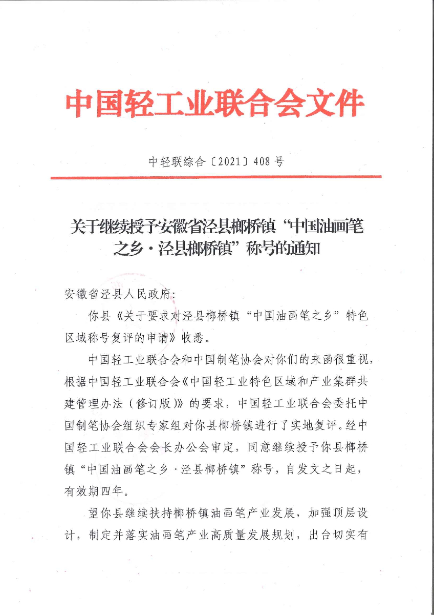 关于继续授予安徽省泾县榔桥镇“中国油画笔之乡·经县榔桥镇”称号的通知