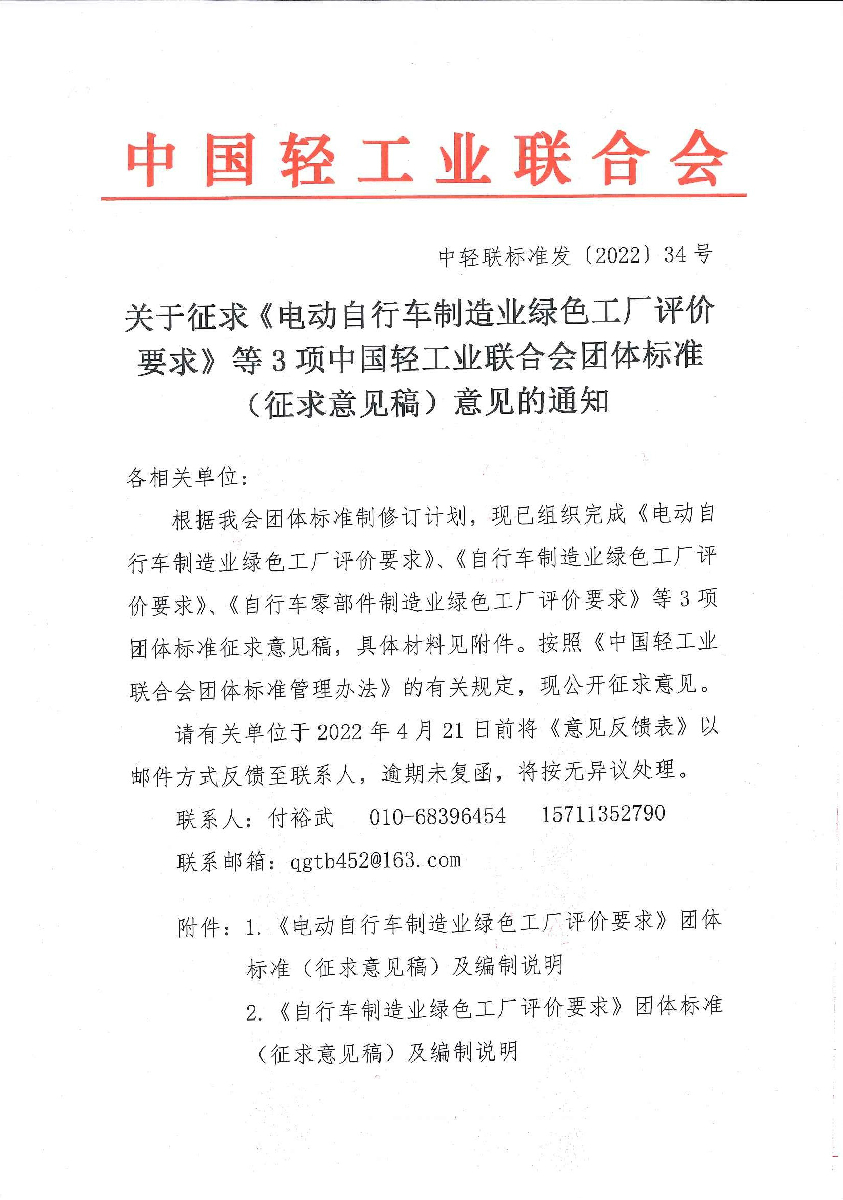 关于征求《电动自行车制造业绿色工厂评价要求》等3项糖心视频业联合会团体标准(征求意见稿)意见的通知