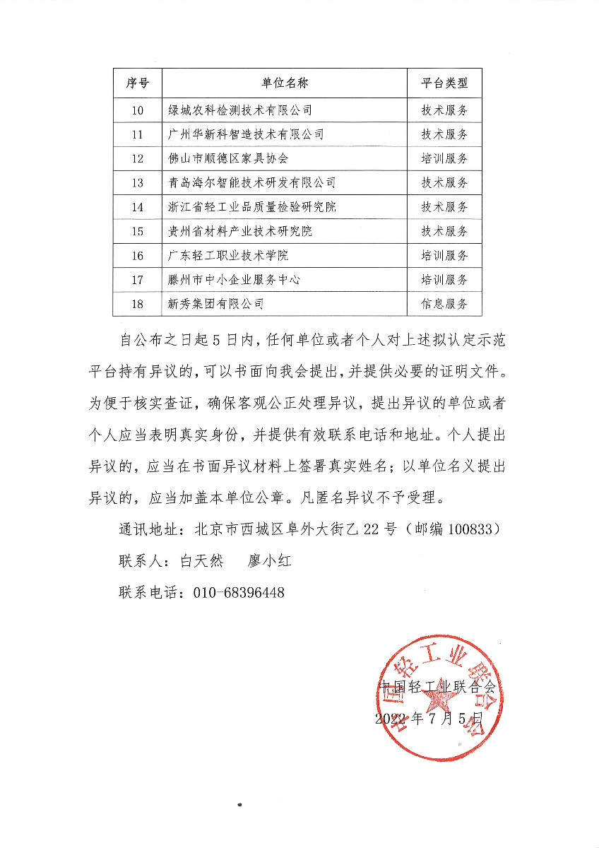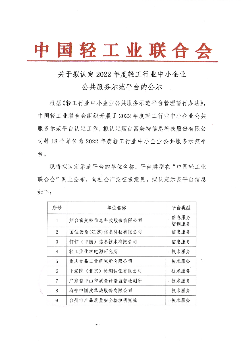 "糖心视频观看" 关于拟认定2022年度轻工行业中小企业公共服务示范平台的公示